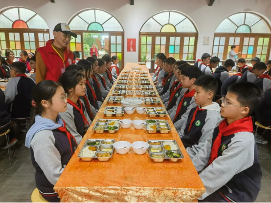午餐时间,同学们整齐划一地进入餐厅,一名名身穿红马甲的小小志愿者们正在快速而有序地为大家分发餐盒,同学们在进餐中做到有条不紊,让我们为他们点个赞吧!