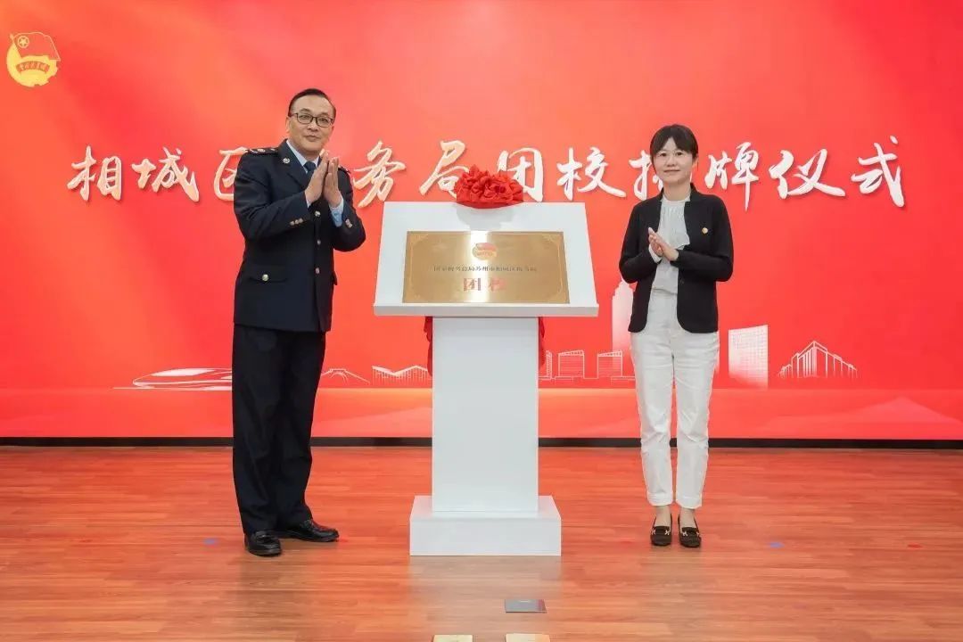 认真学习宣传贯彻党的二十大精神,坚定不移跟党走,坚持为党育人,始终成为引领中国青年思想进步的政治学校,在广大青年内心深处厚植对党的信赖、对中国特色社会主义的信心、对马克思主义的信仰。为坚定理想信念、筑牢信仰之基,相城团区委联合区税务局团委创新打造机关领域团校,构建“一个中心+四个着力点”的立体课程体系,围绕党的二十大精神学习,带领团员青年强理论、重实践、大比拼、促才干。苏州团市委组织部部长唐子翔,相城区税务局党委书记、局长陈忠,共同为相城区税务局团校揭牌。