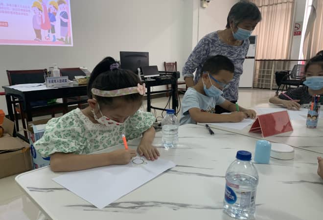 在卡牌头脑风暴环节,每个小组从OH卡的图卡和字卡中各抽取一张,将图卡叠放在字卡上,根据图像和文字,小组成员轮流阐述自己的认知与联想。在“团体作个人画”游戏中,素净的白纸从每位青少年的手中各自启程,仅停留15秒的时间,便需要来到下一站,依次在小组成员手中漂流,最终回到自己手中时,白纸上留下团体共同完成的画作。