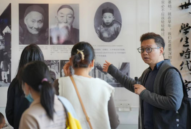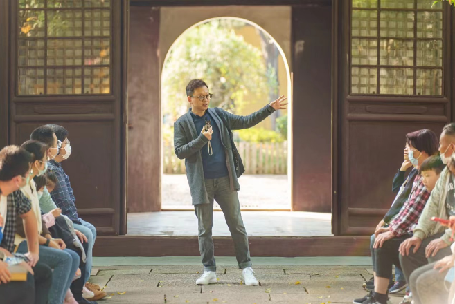 活动中,蒋老师给青少年介绍了叶圣陶先生的事迹。曾在吴县县立第五高等小学执教的叶圣陶先生,一生都对甪直的古银杏树情有独钟。当年,叶老就是在甪直的银杏树下教书育人的,而他教育改革的梦想也正是从这里起航。叶老观景有感,为这盈盈耸立的银杏树,特意书写了一篇散文——《三棵银杏树》,并被收录到了小学语文课本的教材里。穿过寺内,便可至叶圣陶纪念馆。蒋理老师就寺内的一景一物,给孩子讲出了一个个生动的故事。看着小小的保圣寺,却令人驻足聆听许久。