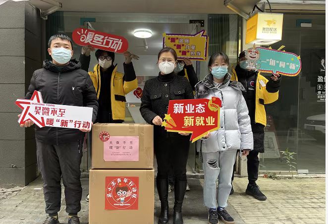 “天气寒冷,大家要注意保暖!”“辛苦啦,出门一定要做好个人防护呀!”关爱小分队为骑手们送上暖心物资,为他们加油打气,并叮嘱他们要做好个人防护及行车安全。