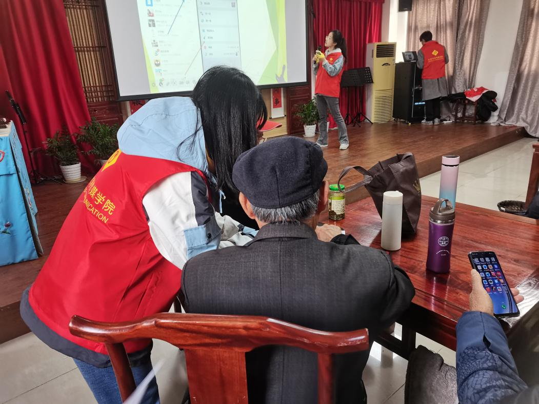 讲解课程结束后,六名负责互动教学的志愿者主动来到老人们身边,进一步帮助老人们解决智能手机使用过程中的难题。“怎么去查手机使用的那个流量?”“我这个一直听不见声音是怎么回事?”针对每位老人不同的疑问,志愿者们进行有针对性地、耐心细致地讲解并帮助他们进行操作。在志愿者的耐心帮助下,老人学会了拨打电话、调整音量、使用微信等基本的智能手机使用技能,更好地感受到了科技给生活带来的种种便利。