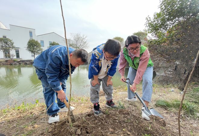 紧接着,青少年们前往室外场地种植果苗,大家分工明确,相互配合,挖坑、放苗、填土、栽种,浇灌,每一个环节都井井有条,呈现出一派热火朝天的劳动场面。
