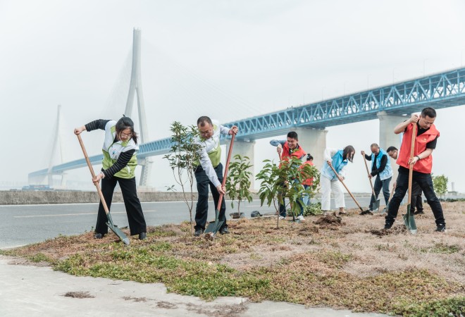 随后,志愿者们兵分四路,有的手持夹子、垃圾袋等清洁工具,沿着江堤岸线清理烟头、易拉罐、水果皮等垃圾,并进行分类处理;有的将分装好的白丝、鲫鱼鱼苗,缓缓倒入长江中,营造了保护渔业资源、维护水域生态环境的浓厚氛围;有的手持画笔,在帐篷上描绘出保护母亲河的生动画面,为保护母亲河公益行动增添了华彩一笔;有的挥锹挖坑、提水浇灌,合力栽下丹桂、脆皮金桔、白兰花等树苗,形成了长江边一道和谐靓丽的风景线。