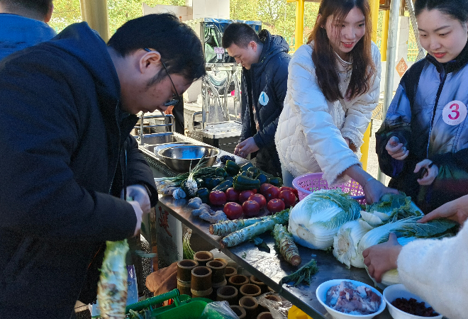 活动最后,大家一起围在大锅灶旁,用自己的双手制作今天的晚餐。从清洗蔬菜到切制准备,从土灶烧火到翻炒均匀,青年们跃跃欲试着手自己擅长的部分,由“各自为战”渐渐互动配合起来。柴火燃得越来越旺,现场暖意融融,一碗碗热气腾腾的家常菜被端上了餐桌,大家感叹:“劳动成果更美味!”