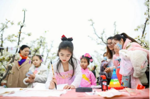 在国学吟春环节中,孩子们吟诵关于春天和丝绸的国学经典,走进古诗词里的春天,在文化熏陶中感受春天之美、丝绸之韵;在梨园寻春环节中,大家纷纷捡拾散落在梨园中和春天有关的成语,感受春之魅;在笔墨颂春环节中,书法爱好者现场泼墨,给春天写诗;在趣味游春环节中,套圈圈、投壶、扔沙包等趣味游戏轮番上演,梨园里满是一片欢乐的海洋;在指尖留春环节中,摄影爱好者用手中的相机捕捉春天镜头,留住春天的脚步;在丝韵添春环节中,关于纺织丝绸的相关知识问答,让青少年增加了对家乡产业的了解;在妙手绘春环节中,孩子们在10米的绸缎上绘制出心中的最美春天,感受家乡的丝绸之美。