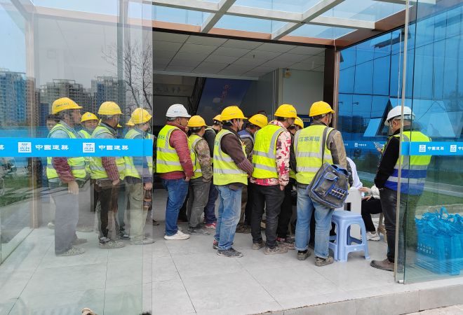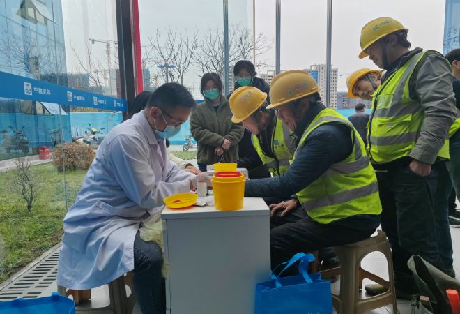 4月6日中午,太湖街道党员代表、医护人员以及青年志愿者共同来到中建三局太泽之星项目部,为工地的工人们进行健康宣传以及免费体检等。讲座过程中,医护人员通过PPT讲解,并结合健康防护手册,向工人们传授如何在复杂的施工现场做好肺部保护、预防肺结核,另外还现场演示了一些基础的防护措施,帮助工人们提高防护意识,做到“高高兴兴上班去,平平安安回家来”。接着,医护人员为工人们进行了现场体检,帮助他们筛查基础传染病,做到早发现早治疗,降低传染风险。