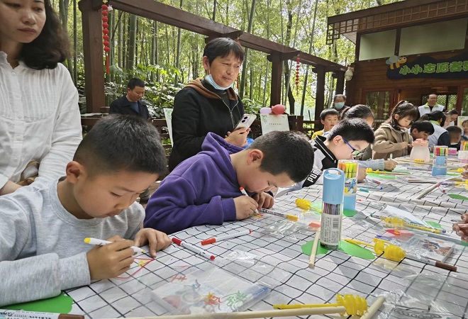 第三环节由竹林掌门人李老师带领大家沿着竹林小道与竹子来个亲密接触,李老师用提问的方式与大家互动,竹子会开花吗?很多同学回答:No李老师解释道:竹子会开花!它会倾其所有用尽生命只为最后的绽放,真是一语道出竹子的气节。青少年们在众多问题中受益匪浅…环绕一圈回到了书屋。我们的老师已经把“风喜欢和我玩”大风车制作材料发放到每个人的位置上。大家激动而又兴奋,由静转动,开始了手工制作环节老师讲解制作方法,青少年们在风车上先画上喜爱的图画,很快在老师家长志愿者的帮助下,一个个大风车在他们的手中转动者,飞舞着。