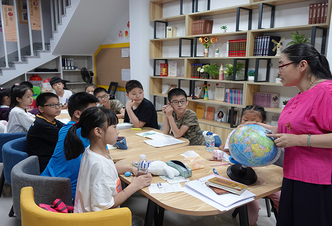 活动中,学生们各抒己见,轮流分享了自己的读后感,家长在一旁仔细聆听,观察了解一本书在不同孩子内心的感受。虽然阅读者的年龄10到14岁不等,带给他们的体会也有深有浅,但是每个孩子都能从一个片段中捕捉到故事人物可贵的精神。经过一番深刻的分享,大家在彼此不同的见解中有了新的认知和体会,为了让大家对书中“航行线路”有更直观的认识,王老师展示了地球仪上南美洲、澳大利亚、新西兰等地的位置,结合通俗易懂的语言,进一步丰富了学生的地理知识。