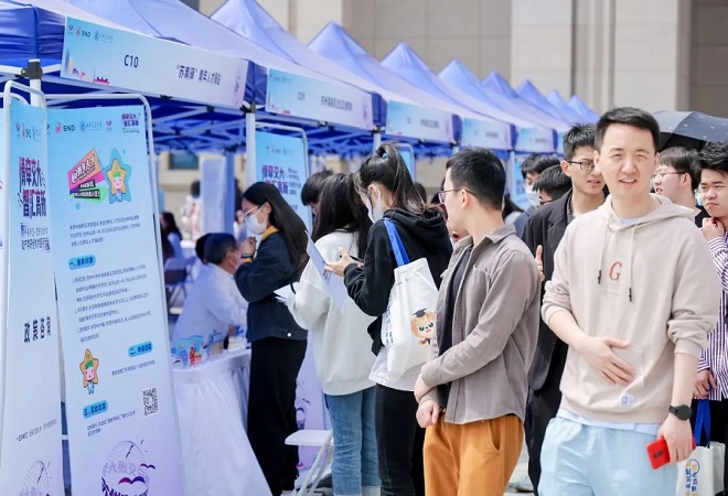 在校园引才活动中,涵英楼外的毕业生专场招聘会人头攒动,区团委专设青年人才驿站宣传摊位,宣传青年学子来高新区求职面试的暖心“第一站”。爱士惟科技、万店掌网络科技等青商会企业也参与招聘活动。