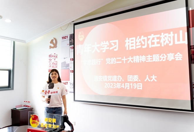 4月19日,通安镇党建办、团委、树山村联合开展“青年大学习 相约在树山”——“学思践行”党的二十大精神主题分享会。青年党团员代表们在“七彩树山”青年学习社共学“青年大学习”第8期,大家交流学习感悟,分享学习心得。活动现场,还为“青年大学习”优秀团组织进行了表彰。青年团员代表马旦萍表示,梦想不会让一个人瞬间伟大,而是让生活拥有色彩和希望。只要你愿意努力,只要你相信,总有一天你会熠熠发光。