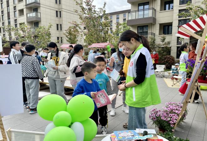上午9点,参加活动的青少年们陆续到场,活动正式开始。由主持人介绍活动流程,大家可以通过5种方式获得积分,分别是好书分享,书签寄语,旧书置换,垃圾分类趣味游戏,学习二十大知识问答。通过积分可以兑换花、草莓、精装图书、文具用品等精美礼品。