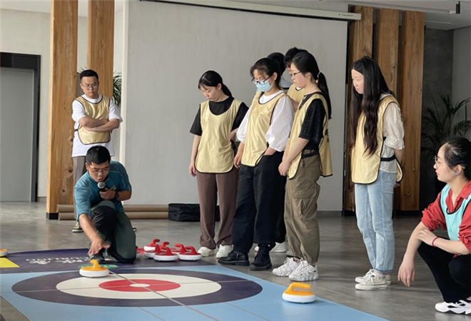 青年代表们首先来到金辰农场农耕文化亲子园、孝廉文化长廊等进行参观,亲身感受了梅李农文旅融合发展的魅力。随后,青年们在教练的带领下开展旱地冰壶比赛。经过讲解冰壶赛制规则,协作演练,大家基本掌握了陆地冰壶的规则及打法。在充分热身和练习以后,金辰农场杯·“青梅破浪”旱地冰壶比赛正式开启。比赛现场气氛活跃,青年们的运动热情纷纷被点燃,陆续上场展现自己的技能。大家在活动中沟通融洽、配合默契,深切感受了陆地冰壶的运动魅力。团建活动在《党的光辉历程》团建游戏中圆满结束,增强了年轻干部的团队意识和沟通协作能力。