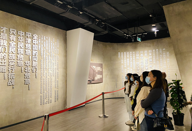 以谢晋元将军的一封家书为序引,民政青年跟随讲解员,缓缓翻开这本沉重的“历史典籍”。纪念馆内的一张张照片、一件件文物、一份份史料、一个个雕像,陈述着淞沪抗战的历史,真实地还原了“四行仓库保卫战”的全过程,震撼着每一个人的心灵。
