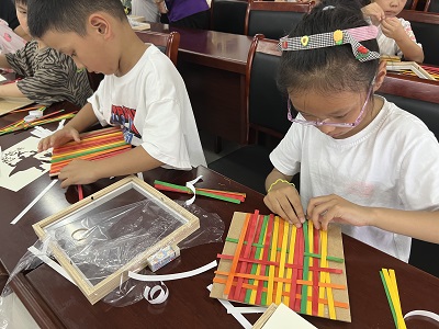 接着,我们开始了手工制作,志愿者向大家介绍了竹编画,并现场演示了编竹编和装裱相框的方法、技巧。只见大家将这些宽度不足1厘米的一片片窄竹条整齐地铺在底板上,再交叉编制。刚开始大家还有些手忙脚乱,经过一遍遍的尝试后,大家慢慢地掌握了一些技巧,越编越顺手,越编越熟练,也越发体会到了其中的趣味。现场氛围轻松愉快,不久一幅幅父爱主题的竹编艺术品就呈现了出来。大家在体验制作的同时,增进了亲子交流,体验了传统非遗的文化。