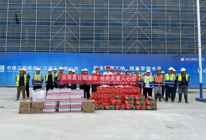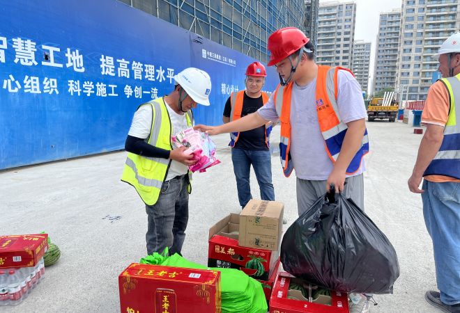 2023年6月21日下午,太湖街道青年志愿者们来到中建三局工地项目部,为奋战在一线的建筑工人们分发派送饮料、西瓜等清凉解暑物资,致敬每一份匠心与坚守。