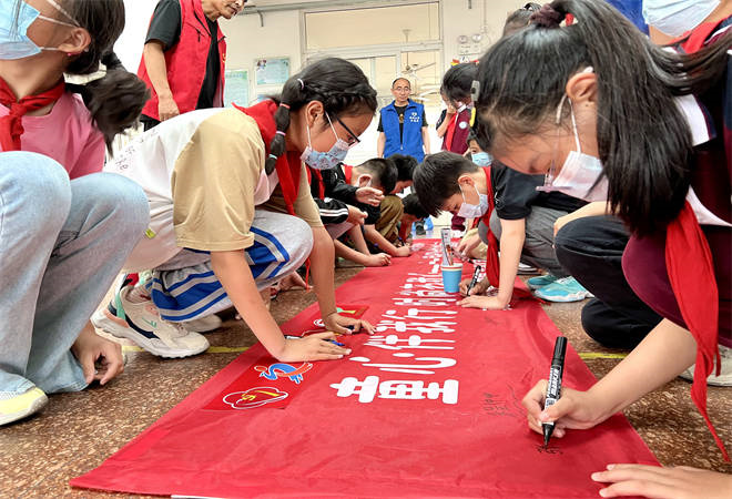 接着,孩子们在“童心伴我行 时尚在我心”的横幅上,签名发起倡议,号召大家保护环境,从自己做起,向身边人宣传环保知识,争当环保小先锋。