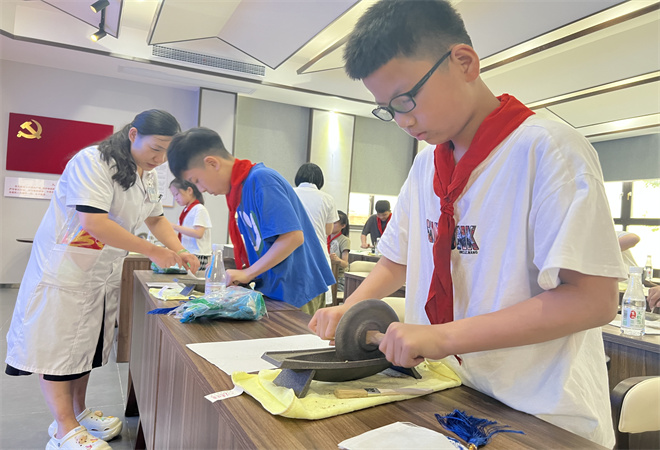 先从认识不同的药材开始,然后在医生导师的指导下拿出中药材自己看一看、摸一摸、闻一闻,通过动手碾压、磨出药粉、装入香囊,同学们认真体验制药的乐趣,整个场馆里也布满着阵阵药香。同学们沉浸式认识了这些可治病、可煲汤、可烹菜的药材,在中医中药文化的无穷魅力中受到熏陶。