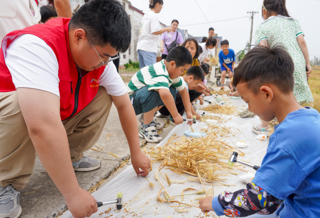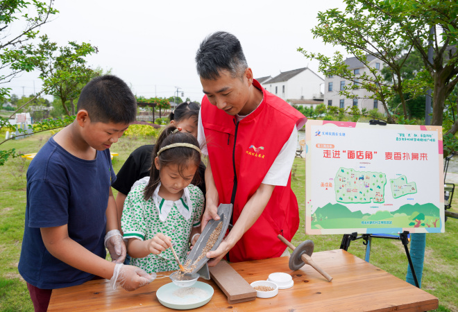 爱阅读,识小麦。团员志愿者首先向大家介绍了今天的活动地点“面店角”的历史小故事:相传古代这一带井水做的面条和豆腐非常好吃,加之面店角也算是当时赶路人歇脚的地方,所以这边的面店和豆腐坊非常有名,渐渐地大家就把这里叫做面店角。如今,经过何北村党委的精心打造,这里俨然成为千村美居“网红打卡点”,吸引着更多人前来了解这片小村庄的故事。而今天的活动主题便是体验这处千村美居点位的农耕文化,由团员志愿者带领青少年进行割麦、脱壳、碾磨成粉的过程。团员志愿者向青少年们推荐了阅读书籍《丰收的粮食》,科普了小麦的生长过程、变成面粉的过程、面粉的种类用途以及其他麦类知识等。