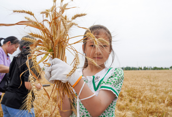 勤劳作,制面食。大家在对小麦有一定认识后,便整齐地排好队伍跟着团员志愿者们来到麦田边,在何北村团员志愿者的教授下,大家使用农具镰刀将麦子一把一把地割下,并集中放在地上用锤子轻轻地捶打麦穗,将小麦颗粒从麦穗上分离下来。随后,小朋友们带着自己辛苦丰收来的小麦回到活动场地,使用手动磨谷器将麦子进行脱壳,在团员志愿者的指导下,使用研磨碾子将脱了壳的麦子进行研磨,经过小朋友们粗加工的面粉虽然没有那么白净细腻,但是这样的过程足以让孩子们感悟到了农民们的辛苦。