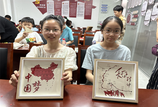 最后,青少年们动手制作了非遗竹编画,将一片片竹篾紧密排列,一压一挑,竹篾错落有致的排列,最后在竹编背景上放上镂空的长征精神、井冈山精神、中国梦等图案,一幅幅红色竹编画就完成啦,在锻炼动手能力的同时,进一步发扬了爱国爱党精神。