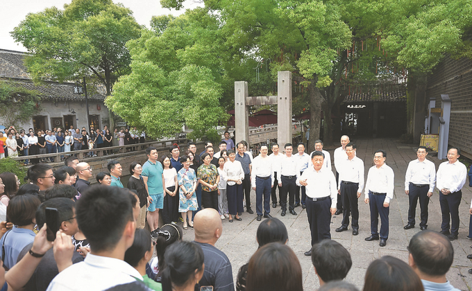 街边小广场上,曲乐悠扬,当地居民和游客正在欣赏苏州评弹表演。看到总书记来了,大家纷纷向总书记问好。习近平饶有兴致地同大家一起观看表演,他对大家说,昨天我看了工业园区,今天又看了传统文化街区,到处都是古迹、名胜、文化,生活在这里很有福气。苏州在传统与现代的结合上做得很好,不仅有历史文化传承,而且有高科技创新和高质量发展,代表未来的发展方向。他对当地负责同志讲,平江历史文化街区是传承弘扬中华优秀传统文化、加强社会主义精神文明建设的宝贵财富,要保护好、挖掘好、运用好,不仅要在物质形式上传承好,更要在心里传承好。