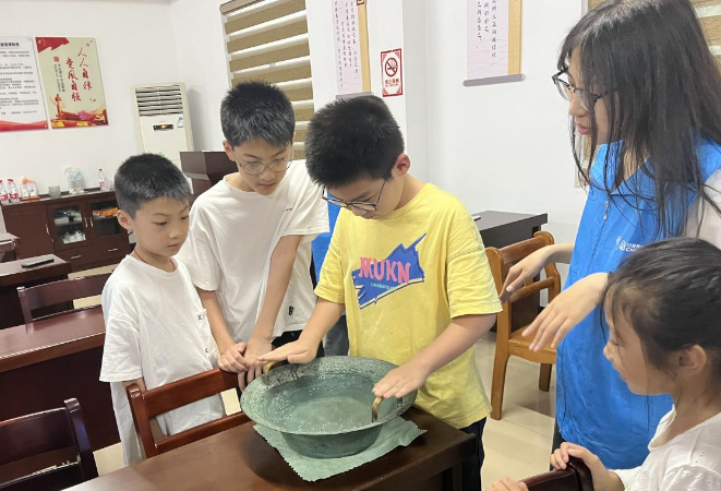 在游戏互动环节,此次共设置三个小游戏,喷水鱼洗、辉光球、磁悬浮地球仪,由志愿者先讲解实验原理,再进行现场演示,小朋友们依次体验,摩擦双耳,水面会出现波纹接着会有水珠跳起的鱼洗;通过接触玻璃面会散发出绚丽光芒的辉光球;悬浮在空中发光自转的地球仪,引得小朋友拍手称赞,通过直观的游戏感受到了物理的奇妙。