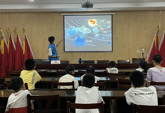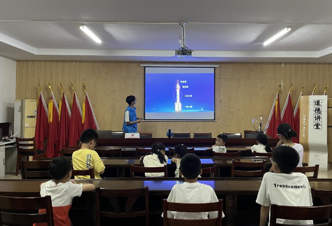 此次活动由“两弹一星”精神宣讲和趣味游戏相结合,首先由宣讲团大学生志愿者通过PPT及视频讲解为现场孩子带来一场不一样的太空之旅,从火箭发射的原理到宇宙中的星系科普,通过现场大学生讲解,孩子们对我国载人航天事业有了一定的了解,意识到航天事业的辉煌成就离不开“两弹一星”精神的激励和鼓舞。