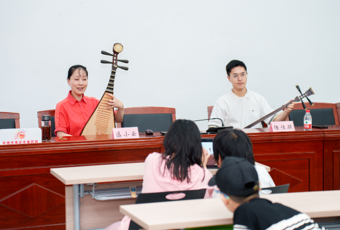 吴侬软语不仅是苏州文化的重要组成部分,更是人们感悟苏州文化的载体。为了更好地保护吴地方言,丰富居民文娱生活,向社区注入浓厚的文化气息,7月18日,甪直镇鸿运社区团支部联合镇团委邀请到评弹名家盛小云老师和陆佳麟老师在社区新时代文明实践站开展了吴文化“小课堂”,带领辖区青少年们听评弹,学苏州话。