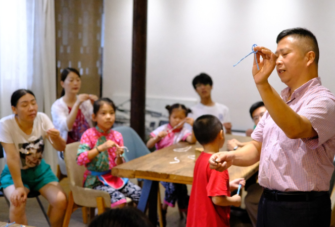 然后大家跟随周师傅来到光影墅,在这里学着打一颗“葡萄纽”。葡萄纽是水乡服饰上的扣子,看着周师傅将一根白色的细细的布条在手指上绕来绕去,一份钟就做出了一颗,可自己要做起来,还真不容易。孩子和家长们都学得非常认真,一遍又一遍地尝试和练习,终于学会啦。最后大家再观摩了周师傅编制“束腰带”。大家纷纷感慨,要做一件水乡服饰,真不容易啊,做衣服的师傅们可真厉害。