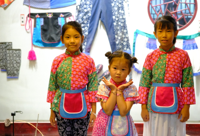 大家开心地换上了传统的水乡服饰,在周师傅的讲解下,了解水乡妇女服饰的基本构成。水乡服饰有八大件:大襟拼接衫、拼裆裤、肚兜、襡裙、襡腰头、包头、卷膀、绣花鞋。经过周师傅的介绍,大家了解到了水乡服饰的巧妙之处,比如拼接的部位,都是容易磨损的地方,这样磨损以后可单独更换,巧妙地延长了使用寿命。