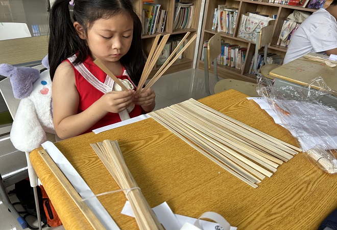 在动手制作的环节中,老师向大家展示了今天的制作成品——竹编团扇,仔细解释了制作过程中的注意事项,并带领大家一步一步的进行操作。老师和志愿者帮助青少年一根一根的穿插竹条,一起体验竹编工艺的挑二压二的技法,将自然之美浓缩在纵横之间。竹编的编织需要细心与耐心,在编织中遇到问题的青少年们都积极互相请教,探讨学习竹编的基本技法,“这边是压一挑二,然后是压三挑二……”经过一个多小时的努力,一把把形态各异的扇子在孩子们手中形成了,体验过编织带来的挑战和成就感,有个青少年兴奋地说:“这是我第一次编扇子,好难呀,但是我也做出来啦~”整个活动现场弥漫着浓厚的创作热情和青少年们欢快的笑声。