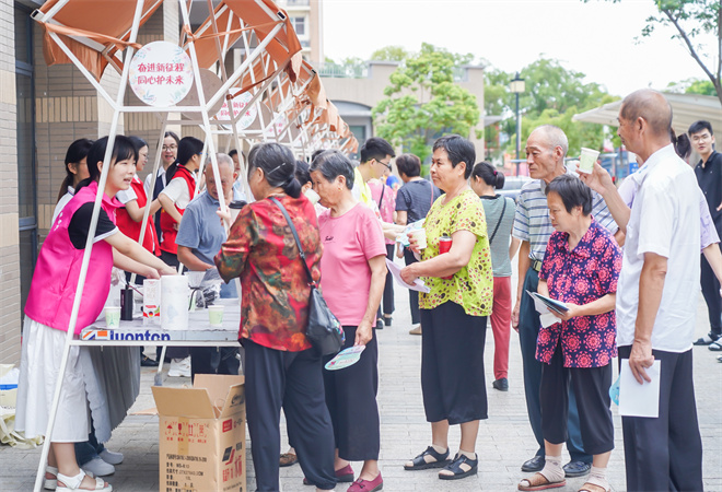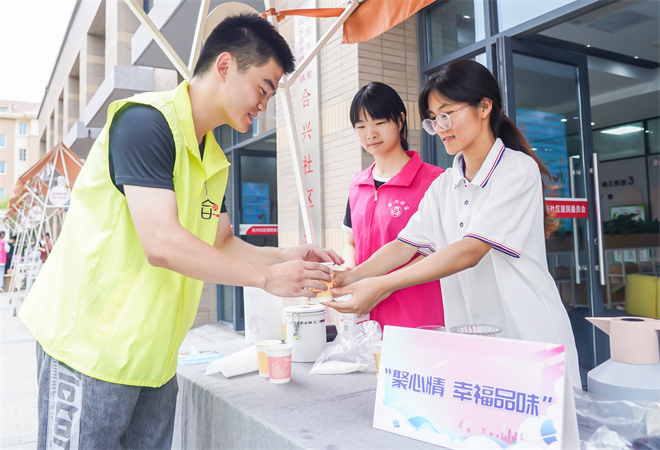 同时,在合兴社区广场上还开设了社区公益集市,设置了“聚心情,幸福品味”现磨咖啡、“聚美味 甜蜜共享”蛋糕甜品、“聚环保,幸福生活”垃圾分类等多个志愿服务摊位,提供串珠手链DIY、手绘存钱罐、免费甜品、爱心理发、免费问诊、垃圾分类等深受社区青少年喜爱的趣味活动与便民服务,青少年们不仅锻炼了自己的各项能力,也学到了很多生活中的小知识,使得他们深切感受到团组织在身边的服务与温暖。
