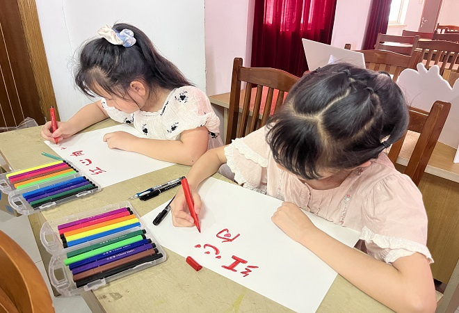 之后志愿者老师又带领小朋友们制作手工军包,画手抄报。 在手工军包制作过程中,志愿者老师一边讲解着缝制包包的过程,一边教孩子们一针一线缝制着象征红军用的小挎包,并在小包上贴上国旗,五角星等对祖国的祝福。整个制作过程中,小朋友们无比专注,穿针、缝线、粘贴动作异常认真。而画手抄报时,孩子们则充分发挥自己的想象力,认真填涂,细致描绘,一笔一画都包含了大家对伟大祖国、伟大时代、伟大中国共产党的热爱之情,承载了孩子们对美好生活的无限憧憬。