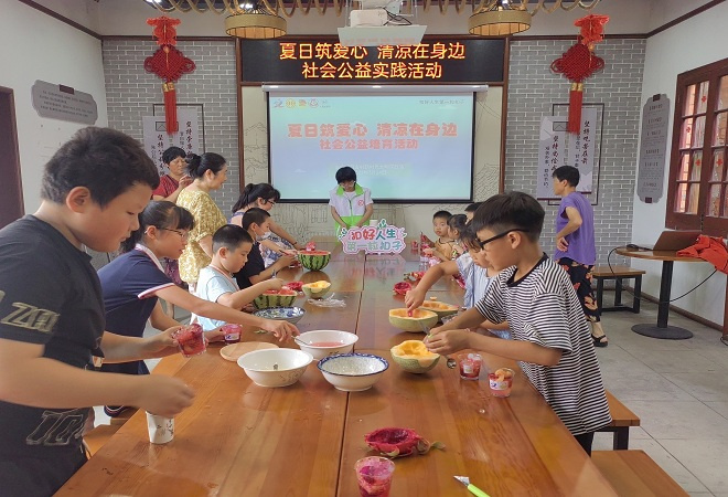 在这火辣的夏日里,孩子们兴高采烈地聚集在一起,期待着制作美味的冰饮。志愿者们事先准备了西瓜、哈密瓜、火龙果等新鲜的水果,为孩子们的自由创作提供了多种选择。孩子们在青年志愿者和家长们的帮助下,利用挖勺将各种水果小心地搭配成一份独特的水果捞,再加上一杯清凉解暑的绿豆汤,组合成为清凉美味的夏日饮品。