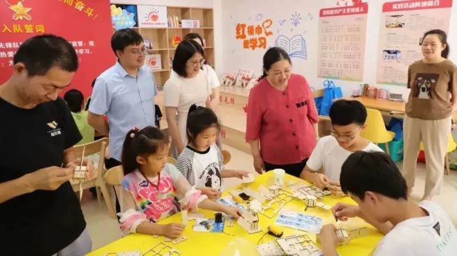 福耀玻璃(苏州)有限公司嵌入式行业性青少年暑托班依托集宿区少工委阵地资源,开展科学体验、兴趣培养、企业研学等课程,帮助职工解决暑期子女照护难题。屈玲妮主任对于在企业办班的做法给予高度评价,在观摩了孩子们动手制作航空航天卫星模型后,勉励他们学习科学知识、掌握科学方法,将来为国家创新发展贡献力量。