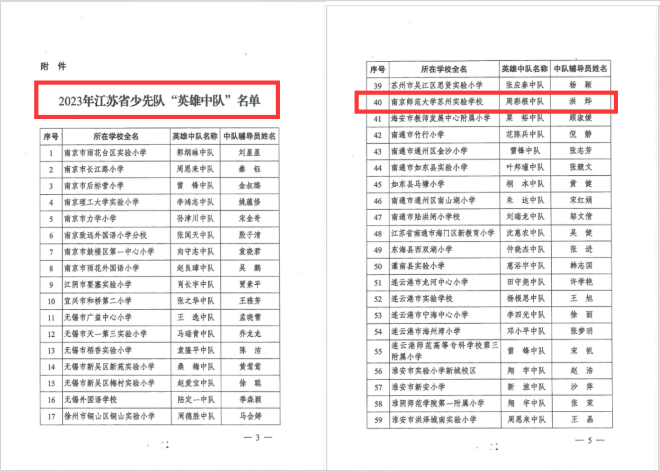 近期,团省委、省教育厅、省文明办、省少工委联合发布《关于公布2023年江苏省少先队英雄中队命名结果的通知》,南京师范大学苏州实验学校周彩根中队被命名为2023年度江苏省少先队“英雄中队” 。