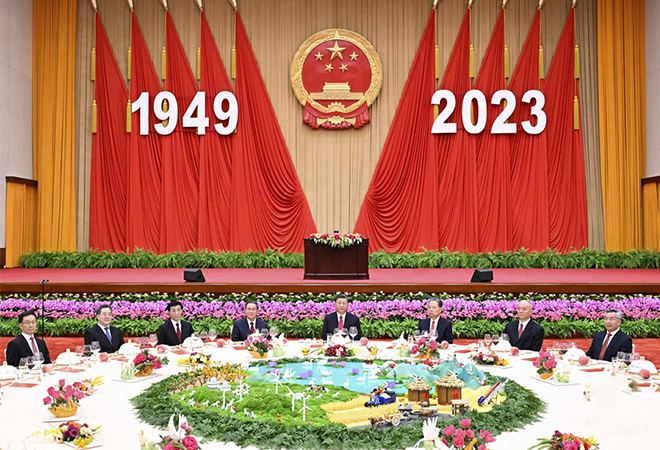 在欢快的乐曲声中,中外宾朋举杯共贺中华人民共和国成立74周年,祝福中国繁荣昌盛、人民幸福安康,中国人民和世界各国人民友谊长存。