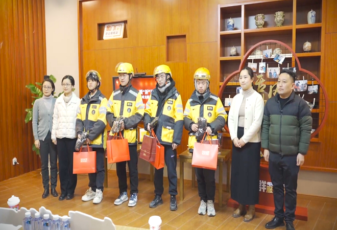 在狮山横塘街道横山社区的青年之家,现场共同观看“习近平看望‘快递小哥’”视频。习近平总书记对大家的一声声亲切问候,让现场外卖骑手们倍感暖心。随后,在交流学习会中,大家热烈交谈,畅所欲言。骑手们介绍自己均为95后和00后,对日常生活、工作方面有着自己的想法和未来的发展目标,目前在苏州这座城市感到充满希望。定制保暖手套、暖宝宝、蛋卷点心、热饮等等,一份份精心准备的“外卖”,一杯杯热气腾腾的茶饮,一句句情真意切的问候,让外卖骑手们感受到了温暖和关怀。