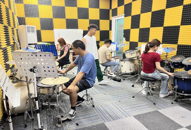 课堂上,老师从学员坐姿、手型开始讲起,通过深入浅出的讲解,向大家传授了架子鼓的基本动作要领,认真指导每位学员练习,培养大家的乐感和学习兴趣。学员们也非常投入地学习,认真掌握每个细节,整个活动让青年们充分感受到打击乐的美好氛围。