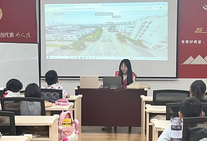 在青灯村、九图村、华盛社区暑托班,来自北京大学的吴颖欣从北大的历史与发展、校园风光、名人风采等方面诠释了北大精神、红色血脉和崭新风貌,带领大家畅想北大、了解北大、感知北大。在西渚社区暑托班,来自南京大学的马乐存向孩子们详细介绍了南大发展历程及南大苏州校区的建设情况,还热情分享了自己在南大的学习成长经历和大学生活中的趣事。孩子们全神贯注地聆听着,不时举手提问,现场气氛热烈。来自香港中文大学的李怡燃也来到了天都大厦暑托班开展公益授课,他表示,“通过本次公益送课,不仅加深了大学生与青少年之间的交流与理解,也为即将踏上社会的我们提供了一次宝贵的实践机会,这是对社会治理奥妙的初次探索,也让大家在服务中领悟了社会责任与担当”。