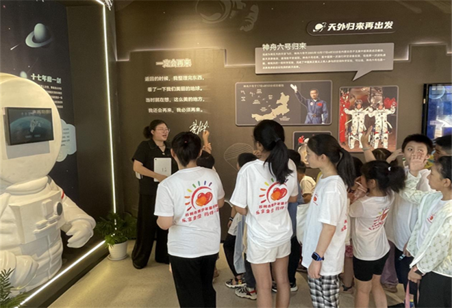 随后,讲解老师深情讲述了费俊龙从飞行员到航天员的非凡历程。从激烈的选拔中脱颖而出,成为苏州地区六名佼佼者之一,再到成为中国首批航天员,费俊龙以不懈的努力和卓越的表现,诠释了“坚持就是胜利”的真谛。他与聂海胜搭档,被誉为“1+1>2”的黄金组合,在神舟六号任务中,费俊龙在太空中的“空中特技”,更是让孩子们惊叹不已。