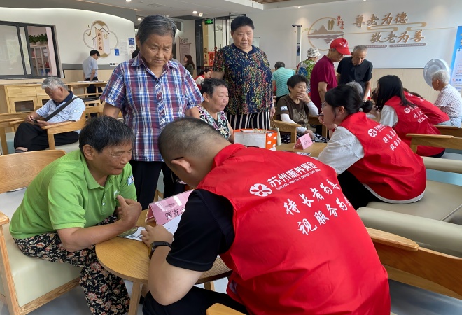筛查区,来自苏州康养集团和浦发银行苏州分行的青年和团员志愿者们在苏康养居家平台工作人员的指导下,为长者提供专业、细致的认知症筛查服务。一位参与活动的阿姨感慨道:“这样的活动很贴心,不仅让我们了解了认知健康的重要性,还让我们感受到了社会的关心。”