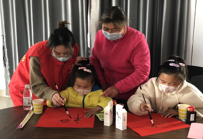 贴福字、贴春联是过年的重要习俗之一。志愿者们将红色宣纸、毛笔发给小朋友们,小朋友们在书写过程中全神贯注,年幼的小朋友也在三和村团支部志愿者的帮助下谱写着对新年的美好愿景。
