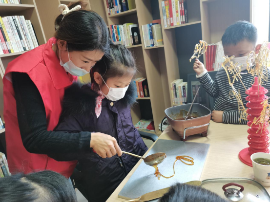 活动中,青年志愿者向孩子们介绍了小年的来源,讲述了小年与糖画的渊源,带领孩子们感受中国厚重的文化沉淀。随后李蒙蒙老师为孩子们展示了糖画的制作过程。一勺糖成一幅画,清透的糖汁在李老师的绘制下很快凝固成栩栩如生的糖画。