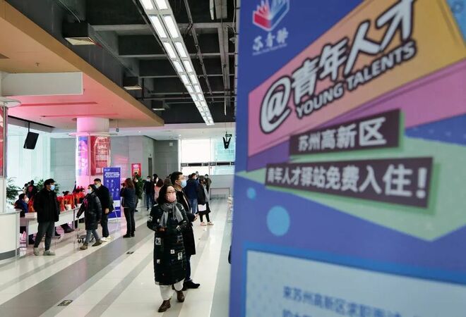 在苏州高新区推进“敢为、敢闯、敢干、敢首创”动员会暨作风建设大会召开的背景下,在高新区人才市场举办了首场虎丘区(苏州高新区)新春人才交流会暨春风行动系列大型招聘会,共提供岗位1706个,入场706人,收取简历1173份,达成意向371人。苏州高新区团委在招聘会现场开设的“苏青驿”青年人才驿站咨询台处,不少求职者用手机拍下驿站的宣传信息。