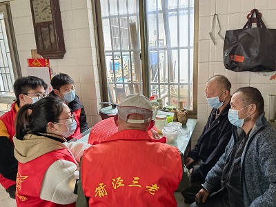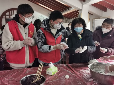 活动中,大学生志愿者和村民两两组队,拿出提前准备好的糯米面粉、豆沙馅等材料,活动现场一派热闹景象,大家有说有笑开始包汤圆,揉、搓、捏、按、团,一块块白白的糯米面在手中团成一个球,一个接一个,呈现在我们面前。包完汤圆后,大学生志愿者和村民先后走到了贫困老人家中,与老人们谈心交流,嘘寒问暖,为他们送上节日的祝福,并将寄托浓浓爱心的汤圆送到他们手上。