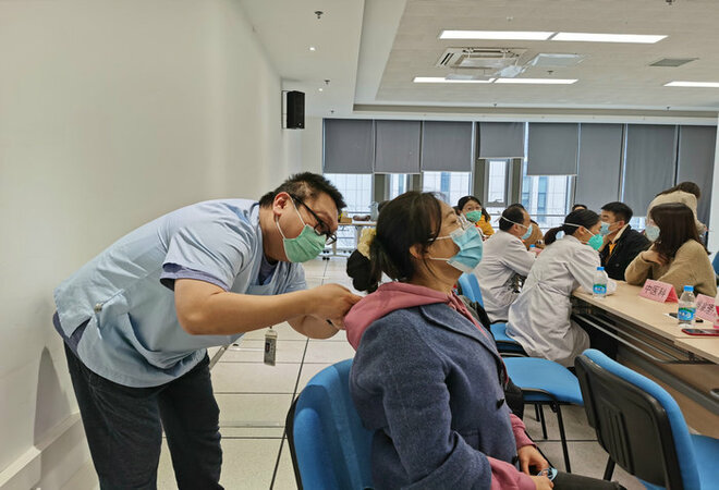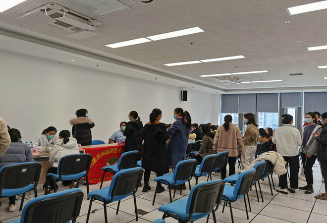 为提高大院大所职工的健康水平,让他们在不影响工作的情况下可以享受到优质的医疗服务,2月17日,苏州高新区团委联合苏州高新区大院大所联合团支部组织医护人员走进国家知识产权局专利局专利审查协作江苏中心(以下简称“审协”),百余位职工及青年志愿者参加活动。10余名医护人员,包含泌尿外科、中医科、皮肤科、眼科、疼痛科、营养科、神经内科等科室。义诊内容丰富、形式多样,有中医号脉、推拿,超声筛查,裂隙灯检查,皮肤镜检查,测量血糖血压以及其他专科医疗咨询指导等等。