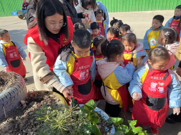 互动环节结束后活动进入正题,小朋友们兵分两路,一部分小朋友捡拾小树林里的垃圾,一部分小朋友给空旷的泥土种上绿植。老师一声令下小朋友们各司其职,捡垃圾种树苗忙的不亦乐乎。废弃的轮胎换了新貌,小树林重现了整洁,小朋友们看着自己的劳动成果都露出了喜悦的笑容。