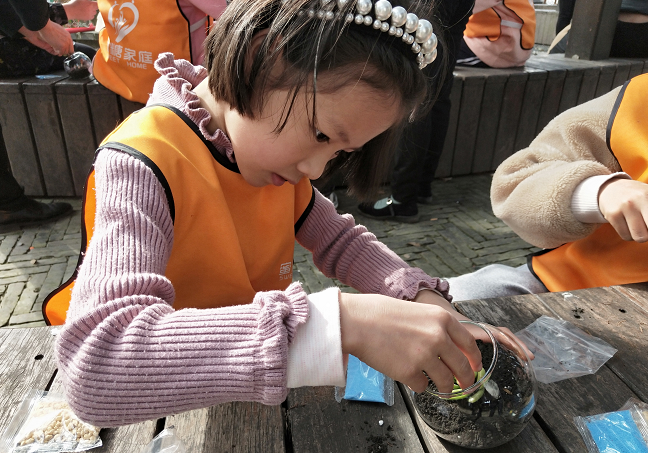 随后的手工环节是微景观的制作, 孩子们在家长的协助下,先将养殖土放进玻璃花盆,然后使用塑料工具将土扒开后将火祭、网纹草等植物栽入盆中后,最后将透水石铺在花盆中土的上面,并将点缀作用的小蘑菇、小鸭子等放置在透水石上。就这样,一盆盆充满活力的微景观脱颖而出。透过坚挺的景观植物,我们似乎看到了“绿水青山”,感受到了绿色生活带来的美好。